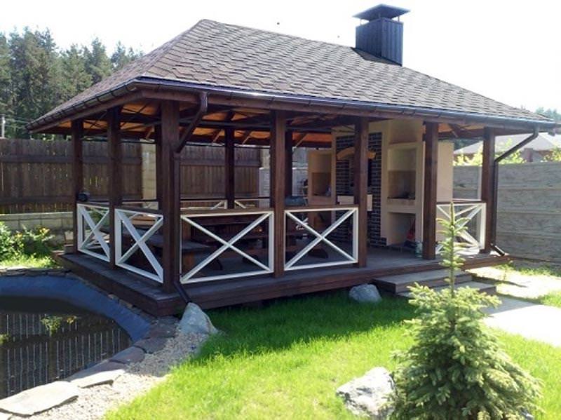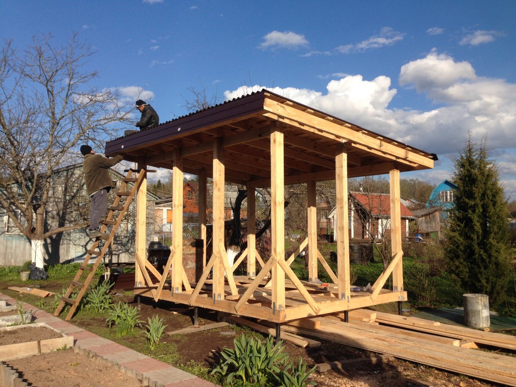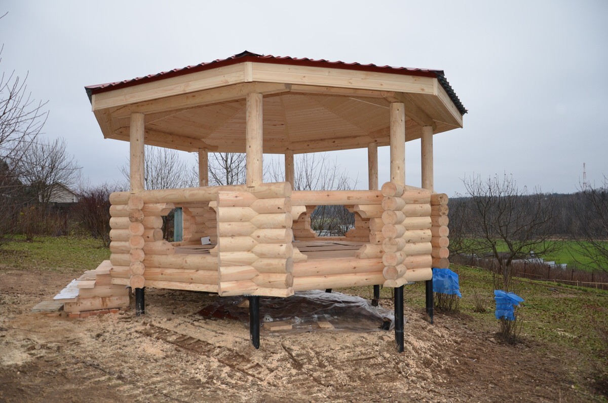 Такие беседки строят для пользования в тёплое время года. Они имеют простую конструкцию: опоры, крыша. Форма может быть любой: круглой, четырёхугольной, многоугольной, ломаной. Возведение такой беседки не требует много времени и средств.