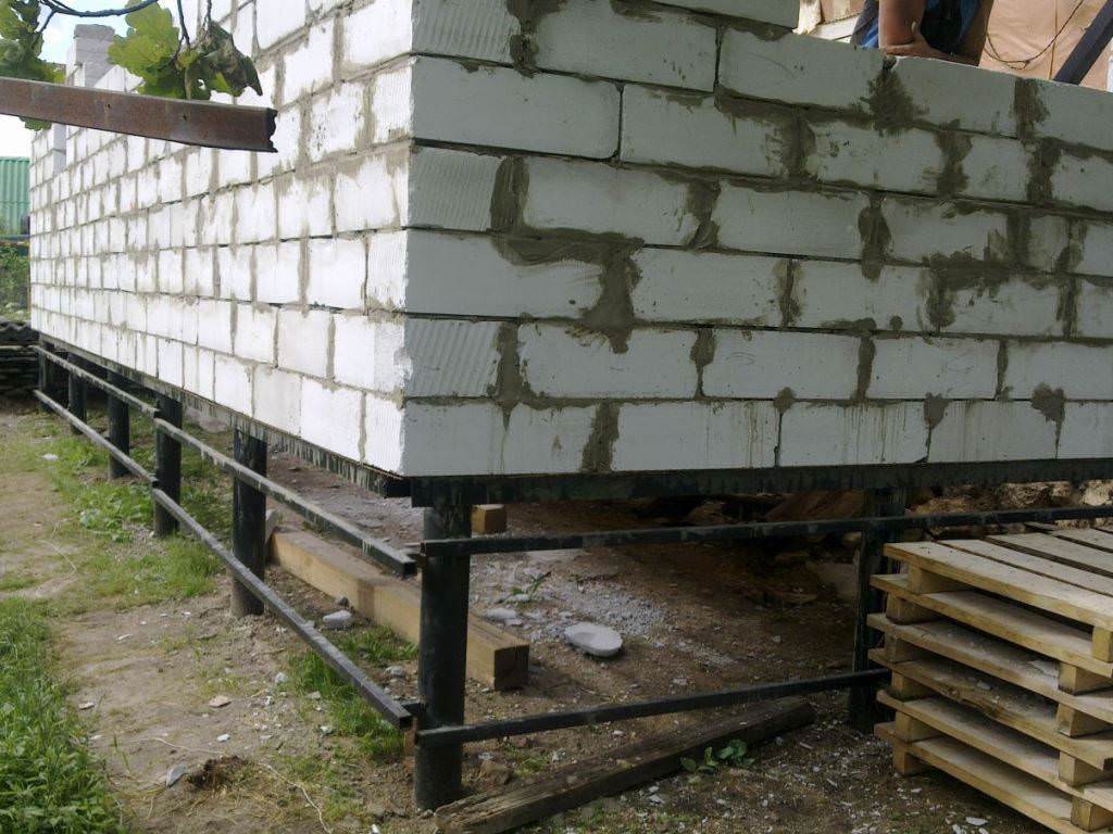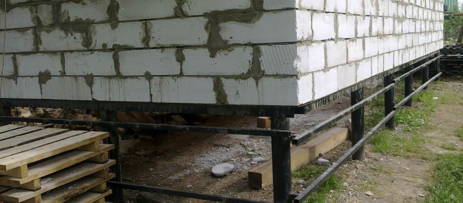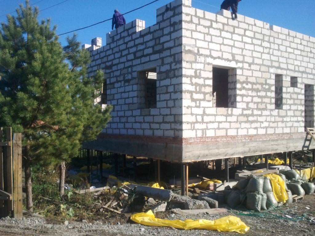 Монтаж свай для фундамента под дом из пеноблоков проводится вручную бригадой рабочих под контролем геодезиста.
