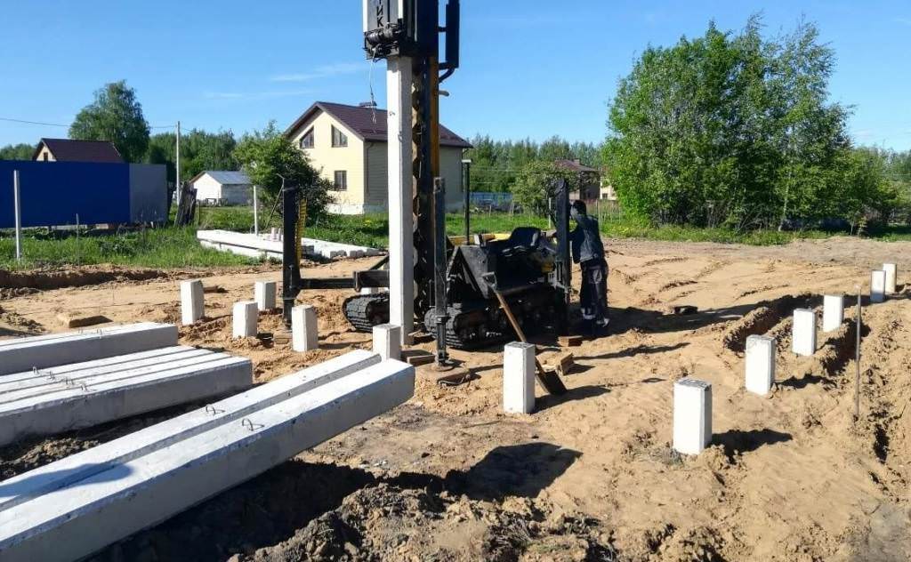 Комплект свай для свайно-винтового фундамента вкручивают вручную или при помощи спецтехники в размеченных местах.